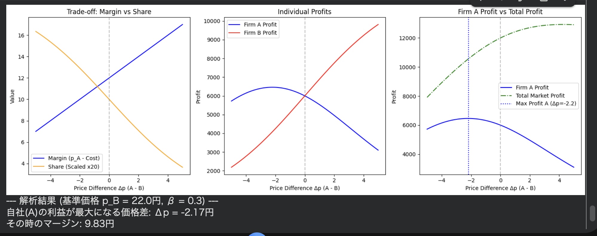 print(f"自社(A)の利益が最大になる価格差: Δp = {optimal_dp:.2f}円")